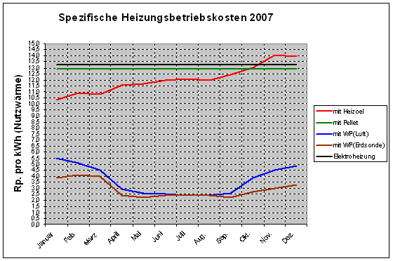 und Ausblick ins 2008  Nie zuvor ist über die weltweite Klimaveränderung so viel gutes und leider auch sehr unsachlich und den Problemen nicht dienliches berichtert worden, so dass es sich erübrigt, an dieser Stelle noch "Neues" zu erklären. Andererseits kann ich in meinem eigenen Tätigkeitsfeld auf ein sehr erfolgreiches Jahr zurückblicken, dies weil die Wärmepumpenaktion 2007 bei besorgten Hauseigentümern sehr gut ankam und "konventionelle" Heizungssanierungen mit Heizkesseln nicht mehr gefragt waren. Dies ist ja auch nicht verwunderlich, wenn man die nachstehende Grafik über die aktuellen Heizungs-Betriebskosten näher betrachtet. Die Aktion wird auch im Jahr 2008 weitergeführt, so dass vorallem Hauseigentümer von kleinern Wohngebäuden weiterhin von der erprobten, kostenlosen Dienstleistung welche in enger Zusammenarbeit mit der Firma CTA AG Münsingen angeboten wird, profitieren können.  |