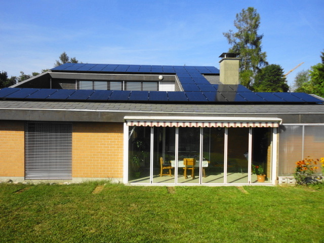 August: Photovoltaik auf unserem Einfamilienhaus Das Dorf Münchringen befindet sich in der Grundwasserzone des Urtenentales und bietet gute Voraussetzungen, grössere Wärmeverbunde mit Wärmepumpen zu realisieren. Stattdessen hat ein grosser Waldbesitzer ohne Vorabklärungen einen solchen mit einer Holzschnitzelfeuerung erstellt. Bei ca. gleichen Investionskosten der beiden Konzepte wären die Betriebskosten mit Wärmepumpen 3-4 Mal günstiger ! Im Jahr 2002 wurde das EFH (1970) anstelle einer Elektrospeicheranlage mit einer Luft/Wasser-Wärmepumpe ausgerüstet. Die Wärmedämmung wurde entsprechend SIA-Normen saniert, so dass heute der Energiebedarf ca. 10500 kWh,a beträgt. Mit der heute erstellten Photovoltaikanlage ist es nun möglich, diesen Strombedarf voll selbst zu decken ! |